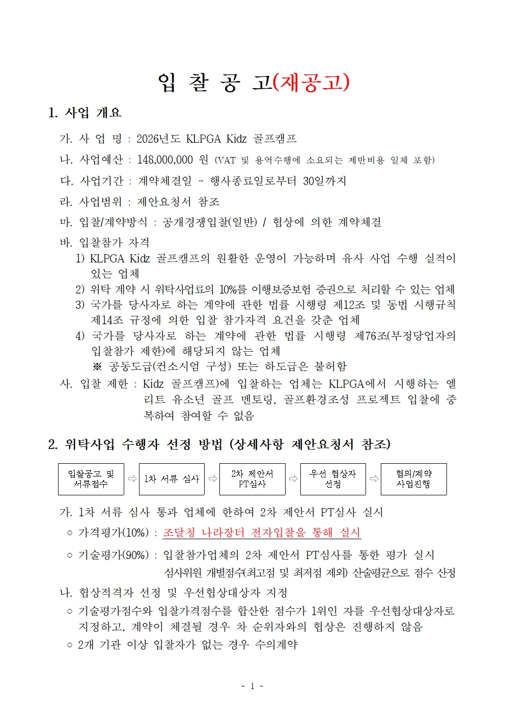 2026년 KLPGA 엘리트 유소년 골프 멘토링 위탁업체 입찰 공고(재공고)
