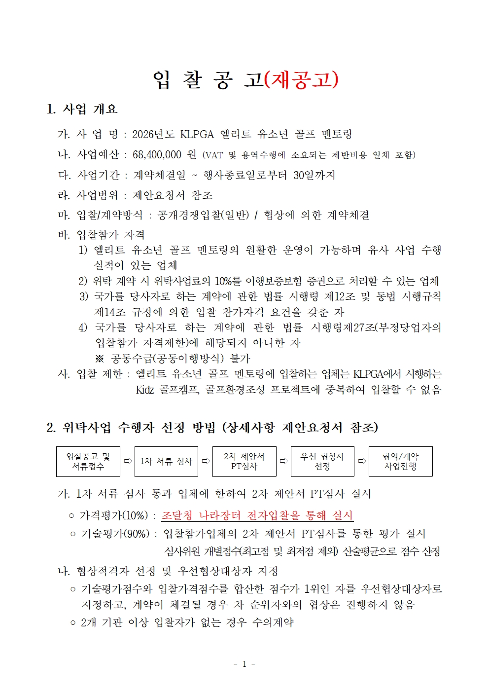 2026년 KLPGA 유소년 골프환경 조성 위탁업체 입찰 공고(재공고)